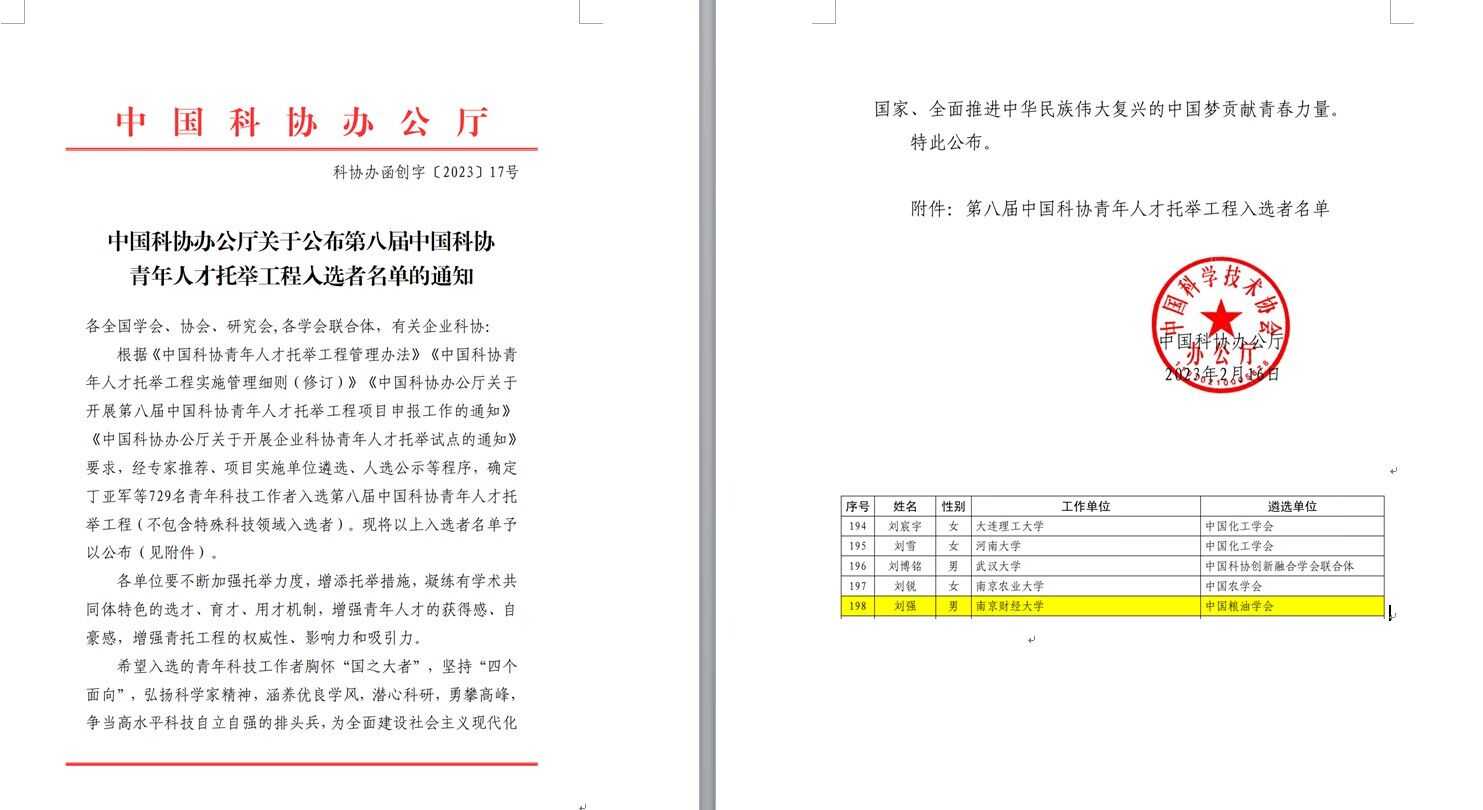 刘强博士在粮油及其食品储藏领域取得了创新性研究贡献,经专家推荐、项目实施单位遴选、人选公示等程序,成功入选中国科协青年人才托举工程,这是百乐门娱乐