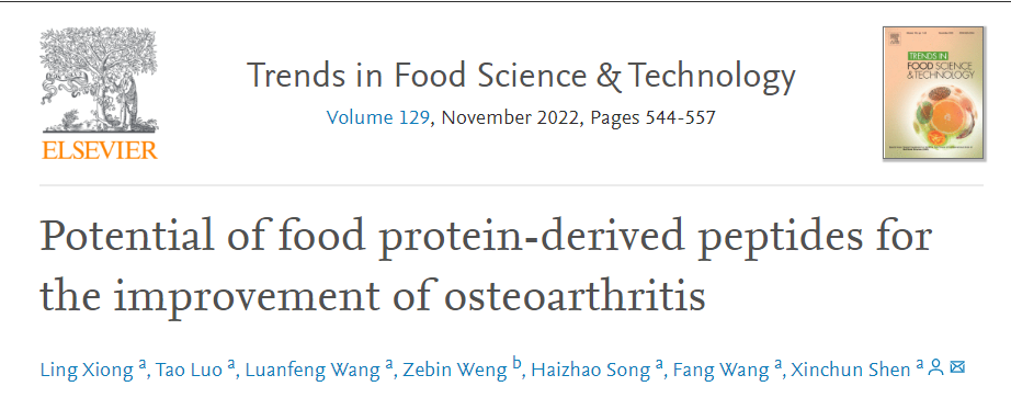 沈新春教授课题组在食品国际顶尖学术刊物《Trends in Food Science & Technology》(Q1,IF=16.002)发表题为 “Potential of food protein-derived peptides for the improvement of osteoarthritis” 的综述论文。该论文以南京财经大学为第一单位,熊玲博士为第一作者。该项研究工作得到了国家自然科学基金面上项目、江苏省高等百乐门娱乐