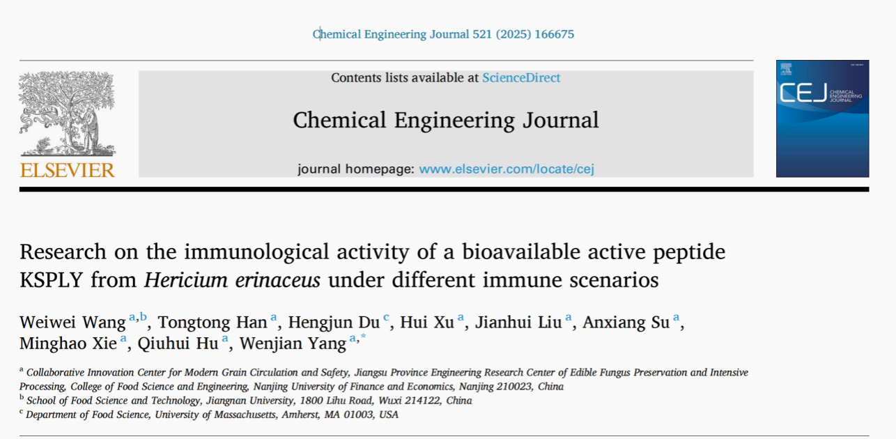 杨文建教授团队在国际顶级期刊《Chemical Engineering Journal》(Q1,中科院1区Top,IF=13.2)发表题为“Research on the immunological activity of a bioavailable active peptide KSPLY from Hericium erinaceus under different immune scenarios”的研究性论文。南京财经大学硕士研究生王威威为论文第一作者,南京财经大学杨文建教授为论文通讯作者。