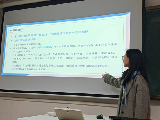分享会上,任春柳同学围绕复试全流程展开系统讲解。在复试流程板块,她梳理了从材料准备、线上线下环节安排到录取确认的关键节点;备考策略方面,强调依据学科特性定制复习计划,重视学科前沿知识的积累;面试技巧分享中,通过个人实例指导同学们从仪容仪表、语言表达、问题应答等细节展现综合素养;面对复试焦虑,她还分享了实用的心理调适方法,鼓励同学们以沉稳心态应考。
