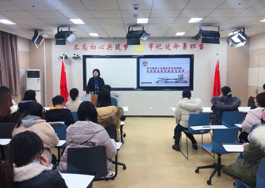 12月29日,校党委常委、副校长邱伟芬教授在工科楼214教室讲授题为“学习贯彻十九届五中全会精神暨加快推进南财国际化进程”的专题党课,百乐门娱乐 部分教师党员代表,全体本科生和研究生党员参加课党课学习。党课由百乐门娱乐 党委副书记周进进主持。