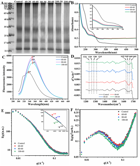 图2.不同热处理对大米谷蛋白构象的影响。A为SDS-PAGE电泳,B为紫外光谱,C为内源荧光光谱,D为二阶导数红外光谱;不同热处理条件下谷蛋白的SAXS散射强度分布(E)和Kratky图(F)。