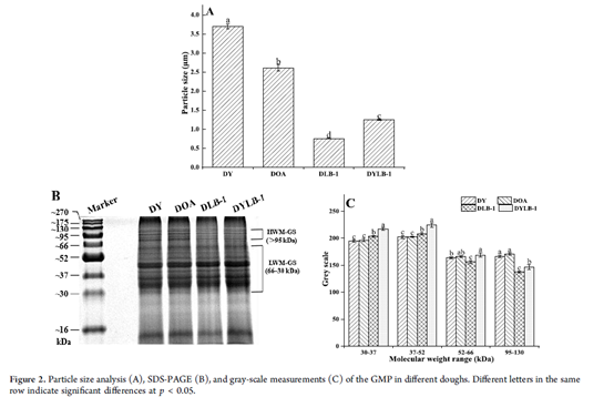 近年来,为了提升面制品的品质并且延长其保质期,化学添加剂被广泛应用于面制品的工业化生产。然而,过度的使用化学添加剂会引起面制品营养的流失,甚至对人体造成致癌、致畸的作用。已有研究表明,乳酸菌作为一种纯天然的、绿色的益生菌,有望替代传统的化学改良剂,在改善面制品的风味特性、质构特性的同时,有效延长面制品的保质期。麦谷蛋白大聚体(GMP)作为小麦蛋白的重要组分,在面团的形成过程中起着至关重要的作用。因此,探究乳酸菌作用下麦谷蛋白大聚体的行为变化对面团品质的影响具有重大的意义。