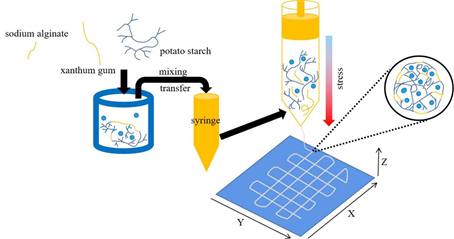 已有一些报道专注于添加食用胶对3D打印行为的影响。但这些研究没有从宏观的计算流体动力学模拟和材料微观物理性质的角度来系统地阐明控制3D形状精度的机制。因此,该文旨在研究不同配方的淀粉复合凝胶对3D打印性能的影响,利用宏观的计算流体动力学模拟和材料的微观物理分析,系统地探索控制3D形状精度的机制,并对3D打印材料的物理性能 (如流变性能) 区域进行标准化。同时,笔者还分析了3D打印过程中材料分子结构可能的演化模型,试图解释3D打印过程中物料分子结构的变化机理。
