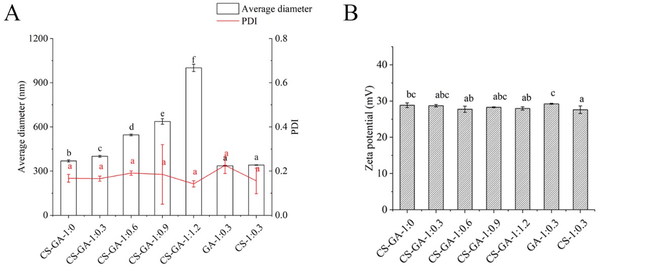 研究表明肉桂醛、壳聚糖与阿拉伯胶之间发生了非共价反应和席夫碱反应。当壳聚糖与阿拉伯胶(CS-GA-1:0.3)混合时,复合纳米颗粒呈扁平球形,结构紧凑,具有更高的粒径、Zeta电位和润湿性,界面张力较低。当肉桂醛先与壳聚糖或阿拉伯胶(GA-1:0.3和CS-1:0.3)混合,再加入高浓度的肉桂醛(CS-GA-1:0.6和CS-GA -1:0. 2)时,纳米颗粒的结构致密性和形态规合性被削弱,导致接触角减小,界面张力增大。所有纳米颗粒均可作为皮克林乳状液稳定剂。当壳聚糖与肉桂醛的质量比达到1:0.6及以下时,复合纳米颗粒表现出明显的抗菌性能。