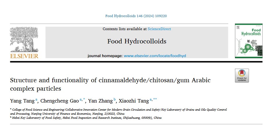 汤晓智、高成成(通讯作者)在国际TOP期刊Food Hydrocolloids(Q1,IF: 10.7)发表题为“Structure and functionality of cinnamaldehyde/chitosan/gum Arabic based composite nanoparticles”的研究性论文。