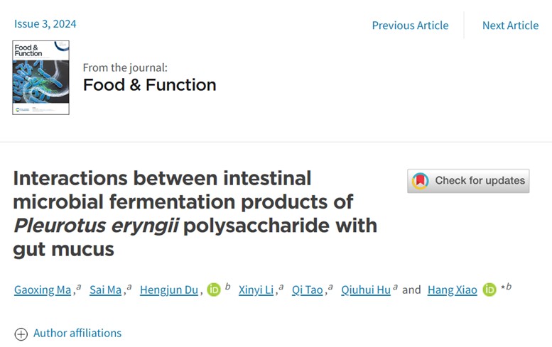 马高兴副教授在国际TOP期刊Food & Function(Q1,IF: 6.1)发表题为“Interactions between intestinal microbial fermentation products of Pleurotus eryngii polysaccharide with gut mucus”的研究性论文。