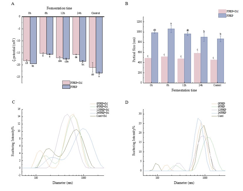 杏鲍菇多糖可以与肠黏液相互作用,互作后的体系分子颗粒明显降低,且更倾向于形成稳定分散的体系。同时,两者的相互作用特征受到肠道微生物发酵时间的影响,具体表现在发酵时间使复合物的稳定性改变和复合物中氢键增强等现象上。