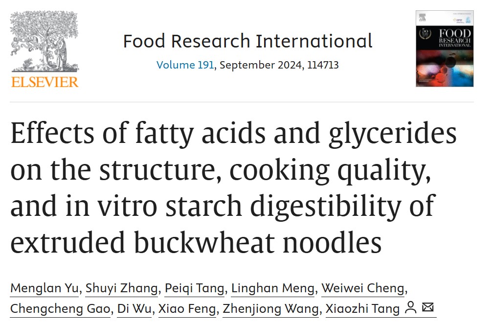 近期,南京财经大学汤晓智教授团队在国际食品TOP期刊Food Research International (Q1, IF=7.0)发表题目为“Effects of fatty acids and glycerides on the structure, cooking quality, and in vitro starch digestibility of extruded buckwheat noodles”的研究性论文。
