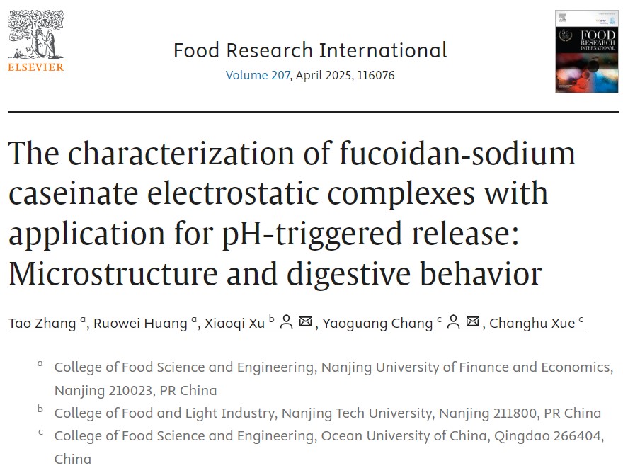 常耀光教授等联合在国际TOP期刊(Q1,IF: 7.0)发表题为“The characterization of fucoidan‑sodium caseinate electrostatic complexes with application for pH-triggered release: Microstructure and digestive behavior”的研究性论文。