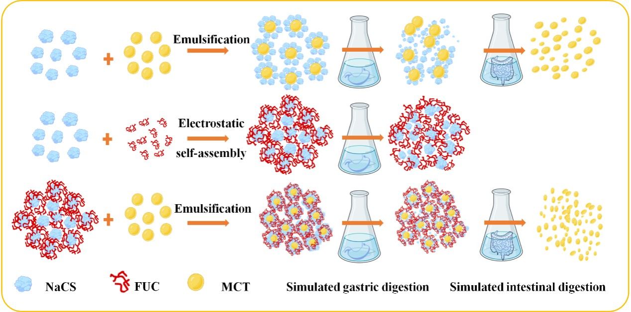 开发了岩藻多糖-酪蛋白酸钠静电自组装配合物,该复合物的特定结构延迟模拟胃消化,且有较高的肠道消化能力。这种简单的自组装系统可用于功能活性物质的pH触发释放。